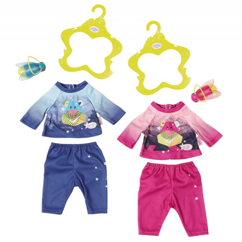 Zestaw składa się z niebiesko granatowej bluzy ozdobionej wizerunkiem misia i gwiazdek oraz granatowych spodenek również ozdobionych gwiazdkami. W komplecie odnajdziemy również niebieską latarkę. Strój zawieszony jest na oryginalnym wieszaczku Baby Born.