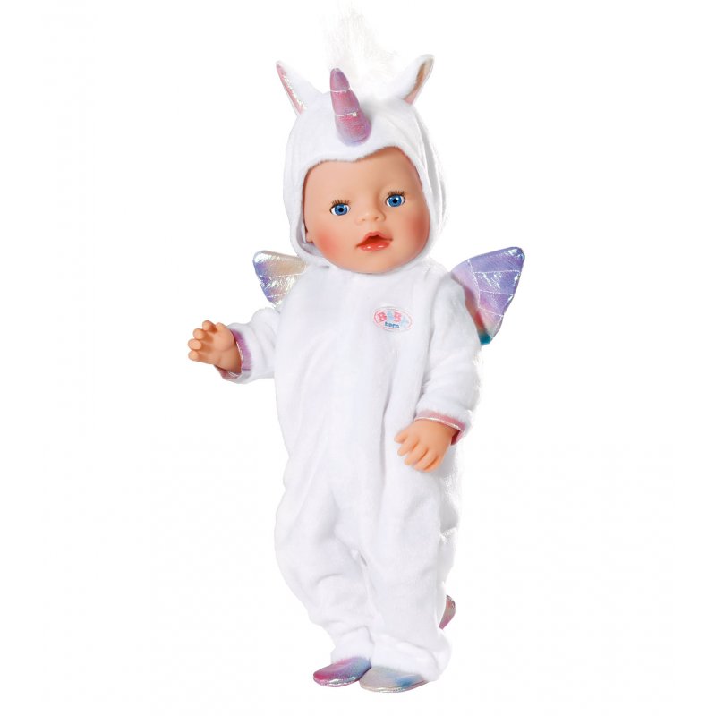 Ubranko wykonane jest z niezwykle miękkiego, białego materiału. Piżamka posiada kaptur z uszami i białą, długą grzywą oraz ogon zakończony kolorowym serduszkiem. Róg, skrzydełka, uszy, wykończenia rękawów, końcówka ogona oraz stópki wykonane są z materiału, który połyskuje wszystkimi kolorami tęczy. Strój zawieszony jest na oryginalnym wieszaczku Baby Born.