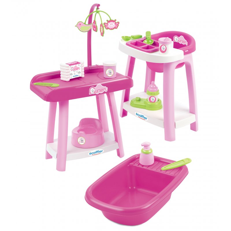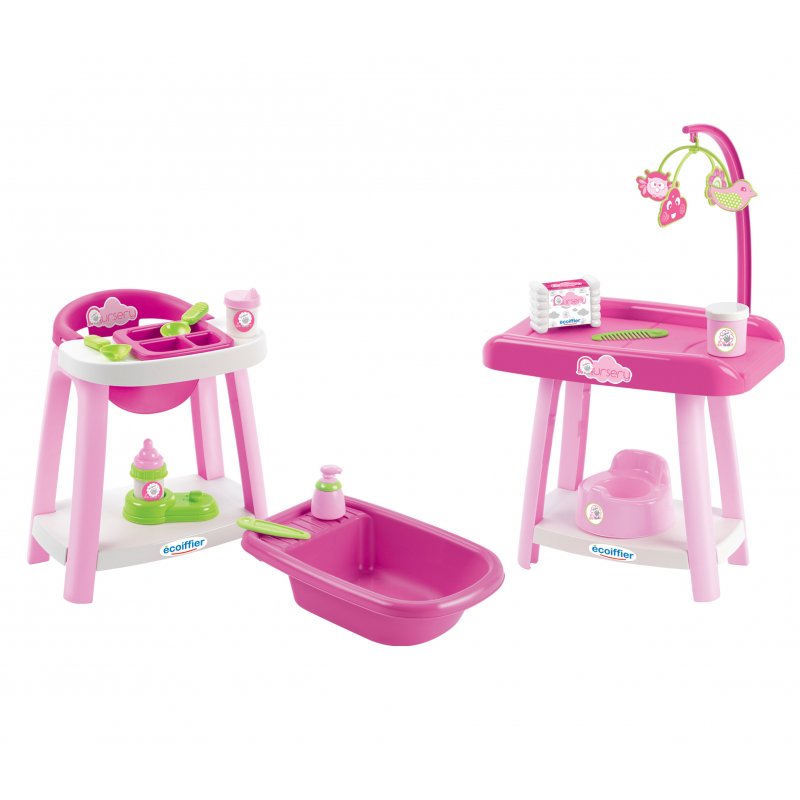 Kącik opiekunki 3 w 1 zestaw: wanienka, przewijak, krzesełko do karmienia zaprojektowany przez cenionego producenta zabawek do przedszkoli francuską firmę Ecoiffier.