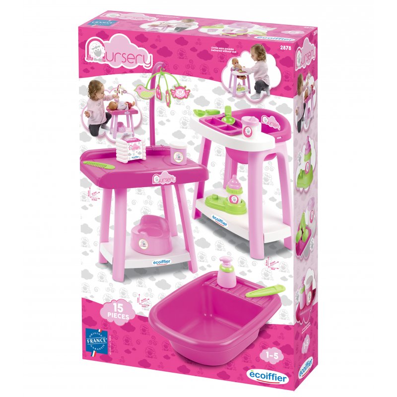 Kącik Opiekunka z serii Nursery dla dzieci od 12 miesiąca to świetne rozwiązanie dla maluchów naśladujących zachowania dorosłych. W zestawie znajdziemy wszystko co potrzebne aby dziecko mogło opiekować się ukochaną lalka lub misiem.