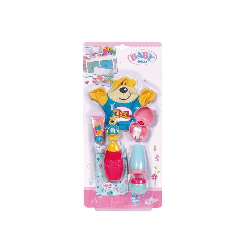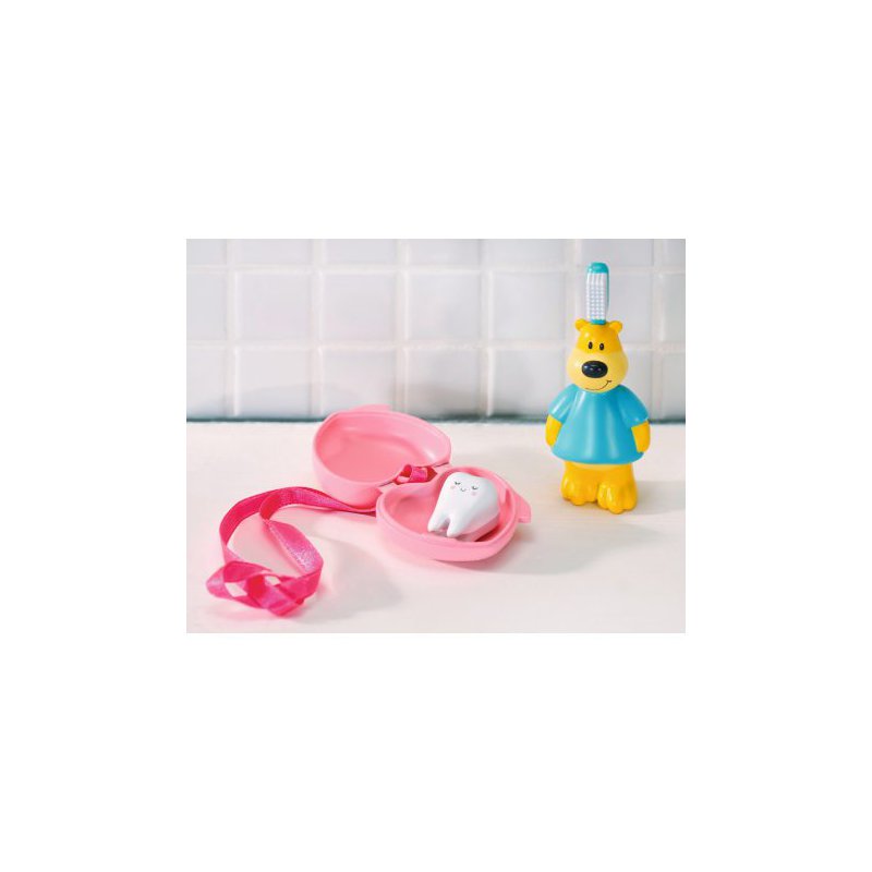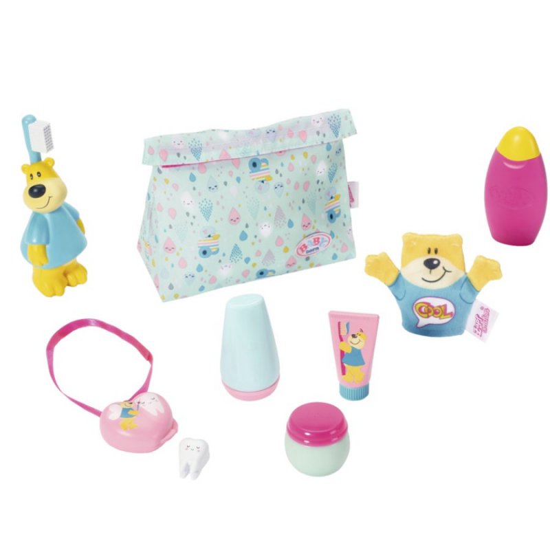 Umyj swoją słodką Baby Born, lub odegraj scenki z tymi fantastycznymi akcesorami. Kosmetyczka w pięknych pastelowych kolorach, pojemniczki na kosmetyki i prześliczna szczoteczka i myjka ze słodkim misiem sprawią, że czas kąpieli stanie się magiczny. Dodatkowo nasza Baby Born gubi pierwsze mleczaki, dlatego do zestawu został dołączony pojemniczek w kształcie serca z ząbkiem.