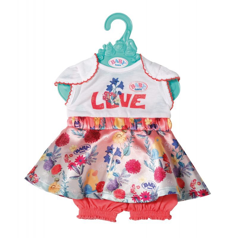 Sukienka dla lalki Trand Baby. Śliczna sukienka z białą górą, wykończoną koralowymi obszyciami z napisem "love" i atłasowym dołem w kolorowe kwiaty, logo Baby born i motyw kaczuszki. W komplecie znajdują się także koralowe spodenki. Strój zawieszono na oryginalnym wieszaczku Baby born. Zestaw idealny dla lalki 43 cm.