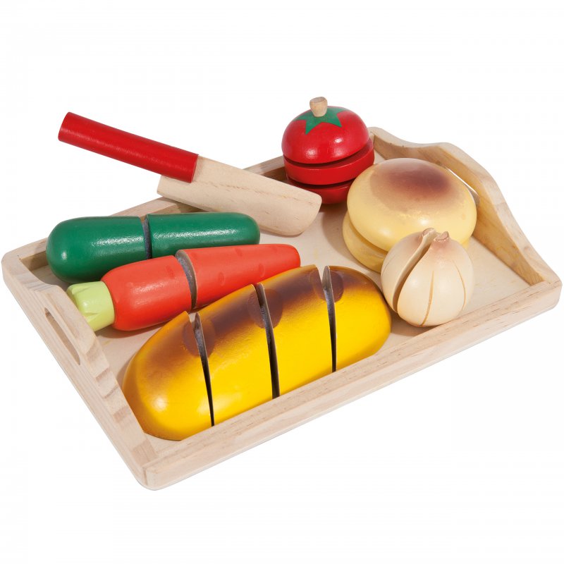 - drewniane kawałki pieczywa i warzyw, połączone rzepami - do zabawy w krojenie