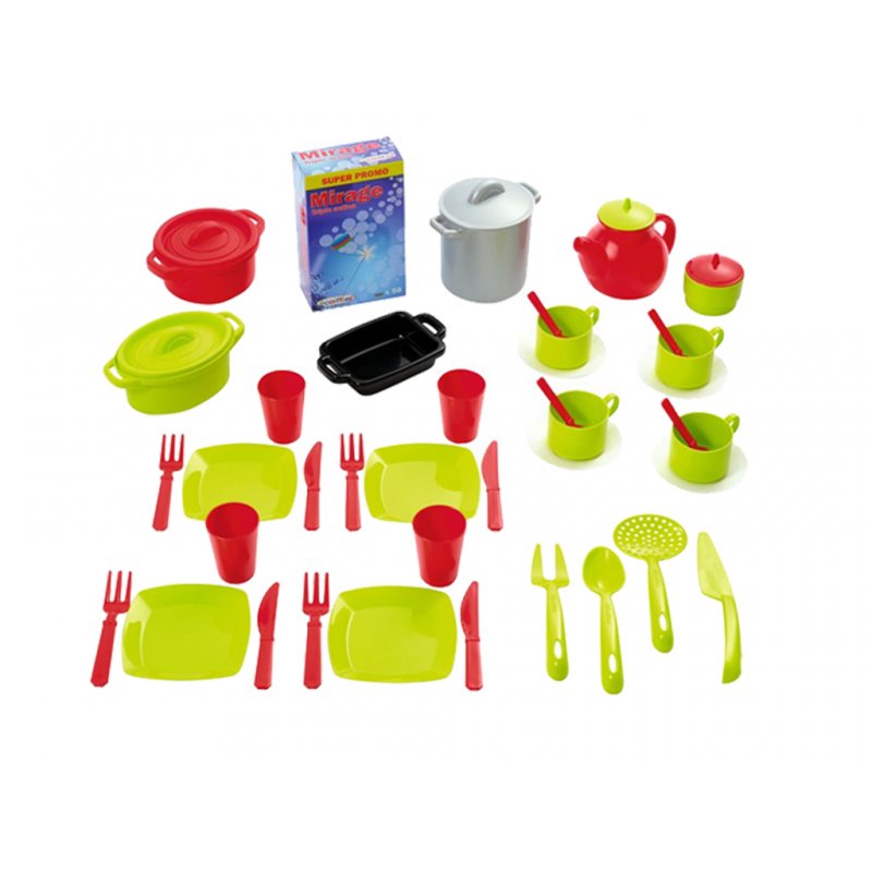 Praktyczny zestaw pomocny każdej młodej gospodyni składający się z 45 elementów: talerze, kubeczki, filiżanki, sztućce, garnki, imitacja płynu do mycia naczyń.