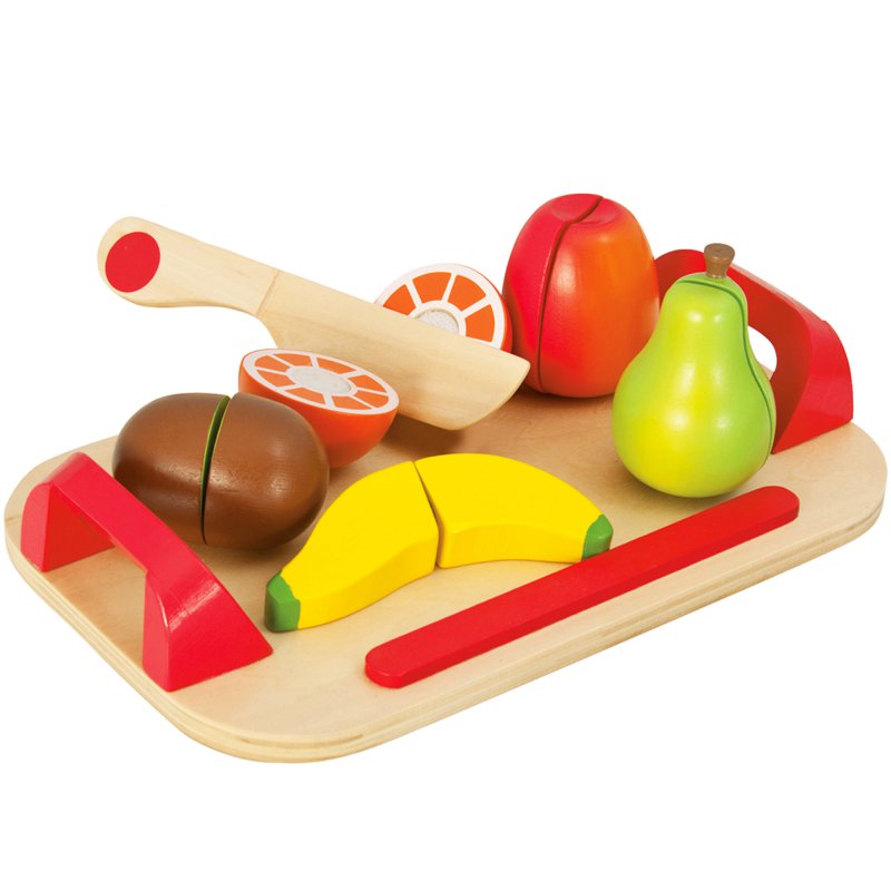 Drewniany zestaw z owocami na desce to doskonała propozycja zabawy dla wszystkich dzieci. Z kolei rodzice mogą wykorzystać zestaw, by zapoznać dzieci z nazwami produktów spożywczych lub pobawić się w opisywanie smaków, kolorów i kształtów.