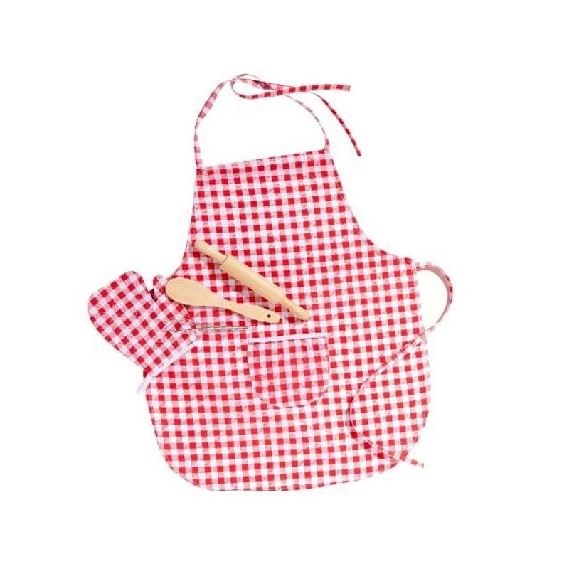 Zestaw małej gospodyni w zestawie z wałkiem, fartuszkiem, rękawicą, trzepaczką oraz drewnianym wałkiem i łyżką, z pewnością będzie stanowił idealne uzupełnienie każdej kuchni.