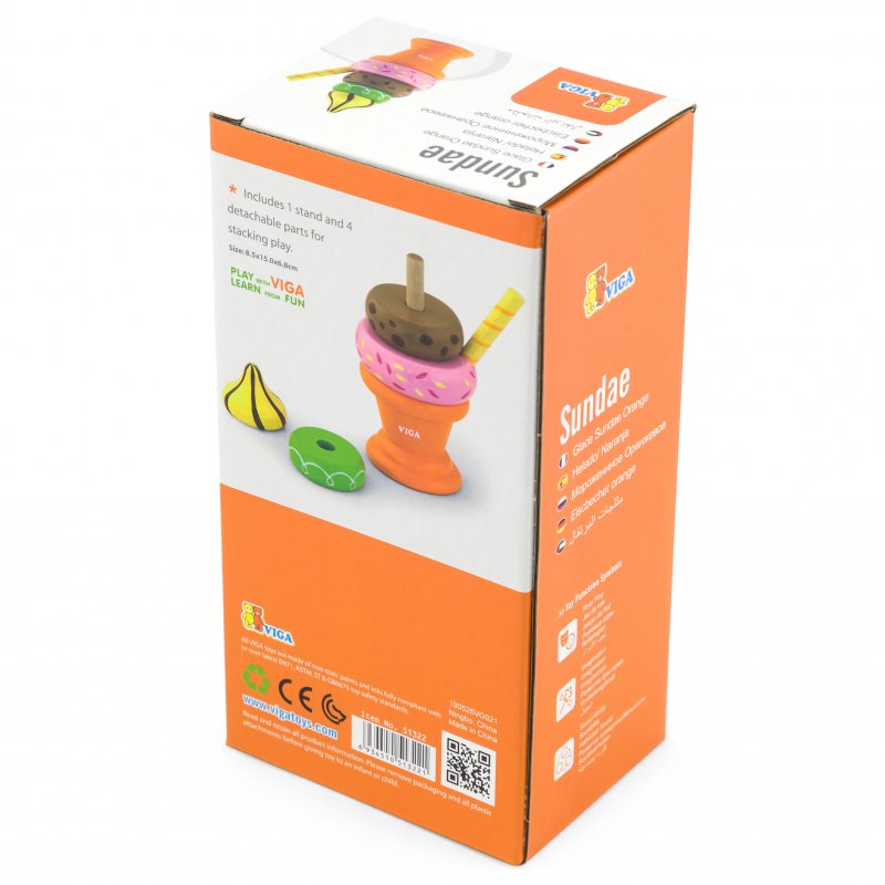 Zestaw zawiera 4 warstwy lodów, które udekorowane są kolorową posypką i ozdobione na czubku słodką wisienką. Zestawy można łączyć ze sobą poprzez nałożenie elementów na drewniany kołeczek.