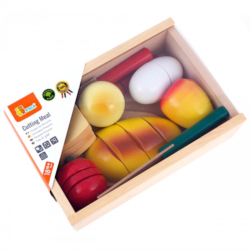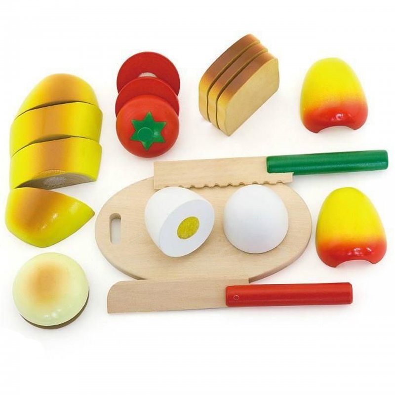 Dzięki bezpiecznemu nożykowi, który jest wykonany z drewna, dziecko z łatwością „pokroi” chlebek, wędlinkę czy serek. Podczas wspólnej zabawy, każdy rodzic będzie mógł nauczyć dziecko jak posługiwać się w przyszłości ostrymi akcesoriami kuchennymi. Dodatkową zaletą jest fakt, że wszystkie produkty połączone są rzepami co daje niekończącą się zabawę. Po skończonym śniadaniu można je z powrotem połączyć w jedną całość.