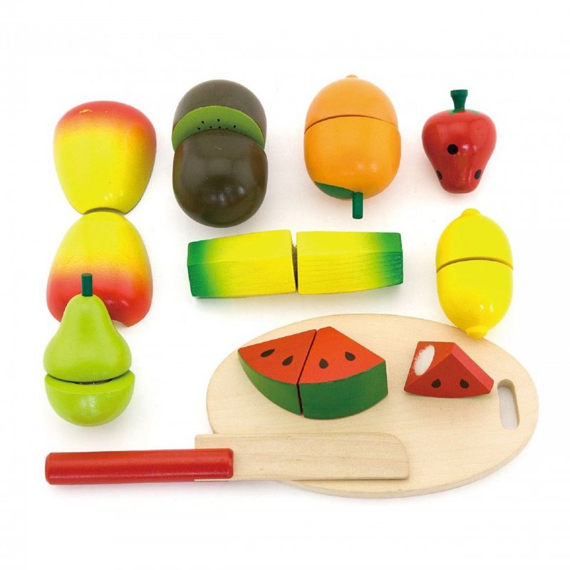 W skład kompletu wchodzi: deska do krojenia, nożyk, arbuz, cytryna, truskawka, pomarańcz, kiwi, jabłko, gruszka oraz banan.