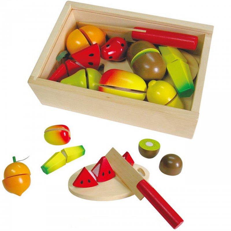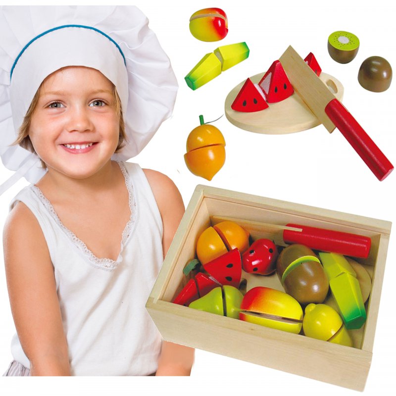 Dzięki bezpiecznemu nożykowi, który jest wykonany z drewna, dziecko z łatwością „pokroi” owoce. Podczas wspólnej zabawy, każdy rodzic będzie mógł nauczyć dziecko jak posługiwać się w przyszłości ostrymi akcesoriami kuchennymi. Dodatkową zaletą jest fakt, że wszystkie produkty połączone są rzepami co daje niekończącą się zabawę. Po skończonym śniadaniu można je z powrotem połączyć w jedną całość.
