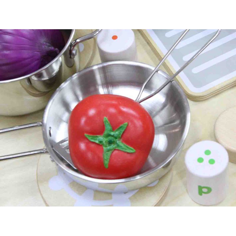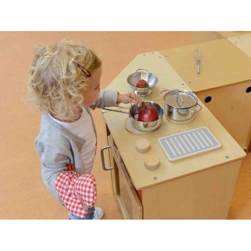 Zabawka sensoryczna dla dzieci, 13-częściowy zestaw akcesoriów kuchennych, które można wykorzystać w połączeniu z kuchnią Masterkidz, lub dowolną inną kuchnią dla dzieci. Zestaw jest inny, niż znane powszechnie akcesoria kuchenne innych producentów, ponieważ wykonany został ze stali nierdzewnej. Bez obaw! Krawędzie zostały zeszlifowane i zaokrąglone, dzięki czemu produkt jest w pełnie bezpieczny.