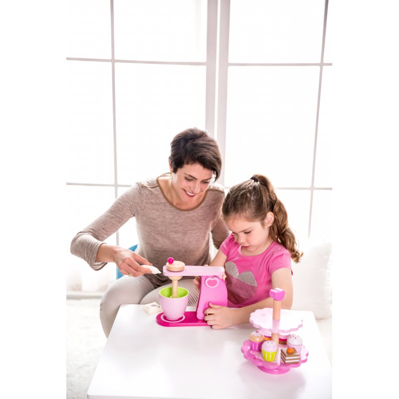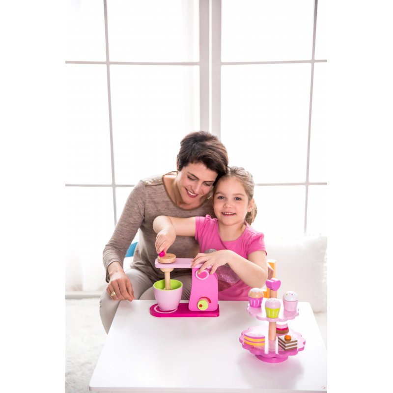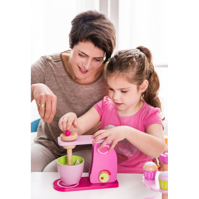 Zabawka wykonana z dbałością o szczegóły. Wystarczy ustawić moc z boku miksera i już można zacząć go używać. Mieszadło obraca się, gdy dziecko złapie za drewnianą kulkę i zacznie kręcić.