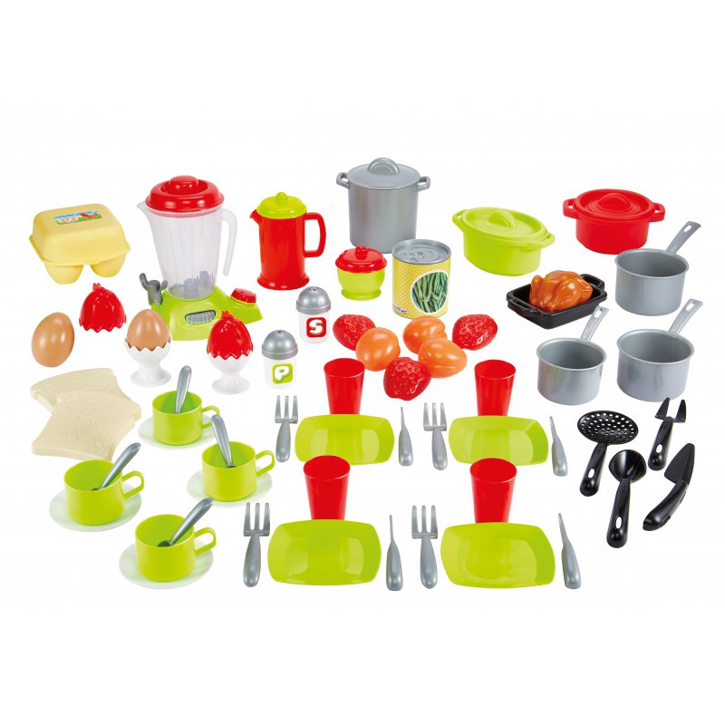 Wieloelementowy zestaw kuchenny stanowi wielką atrakcję dla dzieci oraz wspaniałe uzupełnienie zestawów kuchennych. Jest on niezbędnikiem dla każdej małej gospodyni.