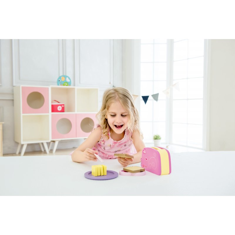 Śliczny toster w serduszka opiecze tosty. Wystarczy włożyć grzanki, a następnie nacisnąć dźwignię, aby tosty wyskoczyły.Bardzo estetyczne, staranne wykonanie i śliczne detale sprawią, że dziecko chętnie sięga po takie zabawki. Dodatkowo całość wykonana z trwałego materiału jakim jest drewno.