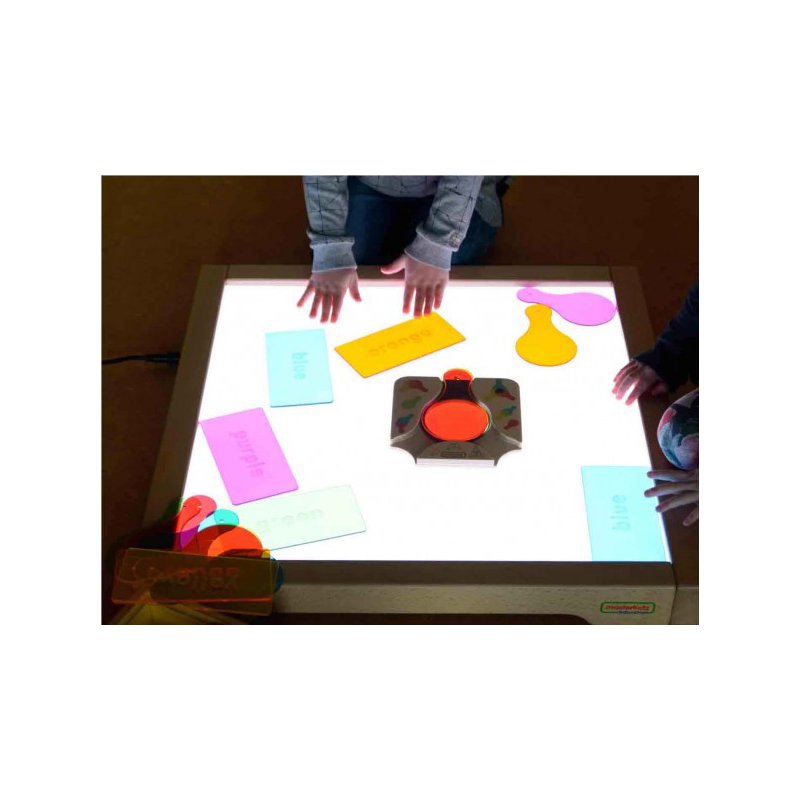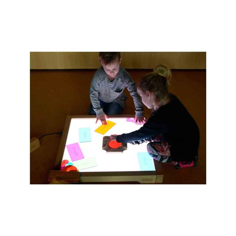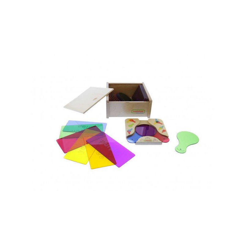 Dzieci mogą umieścić płytki w drewnianej tacy i obserwować mieszanie kolorów. Jeśli do zestawu dodamy tacę lub panel ledowy, kolory prezentują się w prawdziwie bajkowy sposób.
