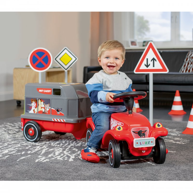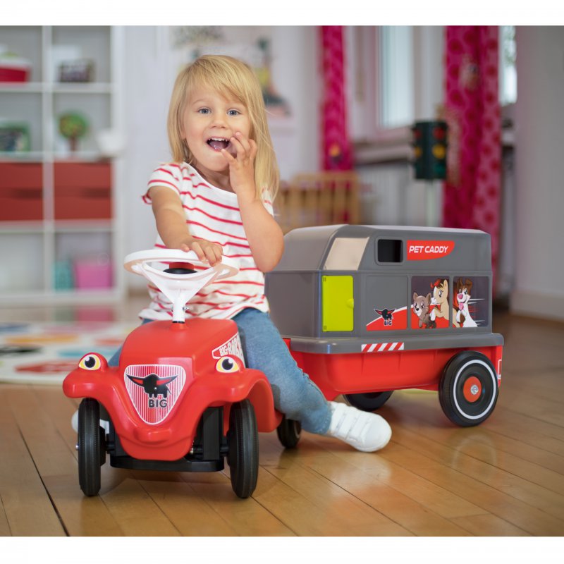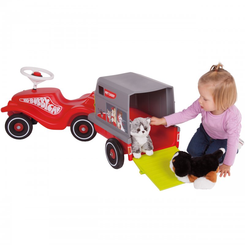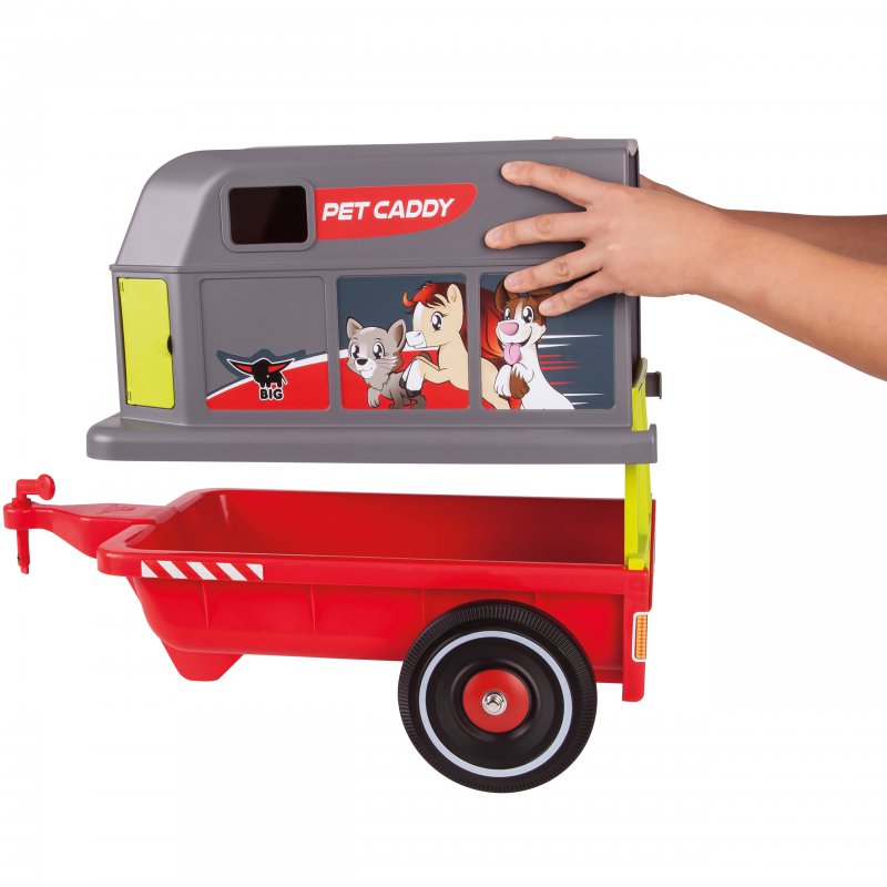 Przyczepka firmy Big do pojazdów Big Bobby Car z serii: New, Classic, Next i Neo. Rewelacyjne akcesorium, które umożliwi przewożenie wszystkich pluszowych zwierzątek. Przyczepa posiada otwierane drzwiczki, które mogą równocześnie stanowić podest ułatwiający wchodzenie i schodzeni. Dodatkowo na ściance przyczepy znajduje się otwierane okienko. Całą osłonę przyczepy można zdjąć.