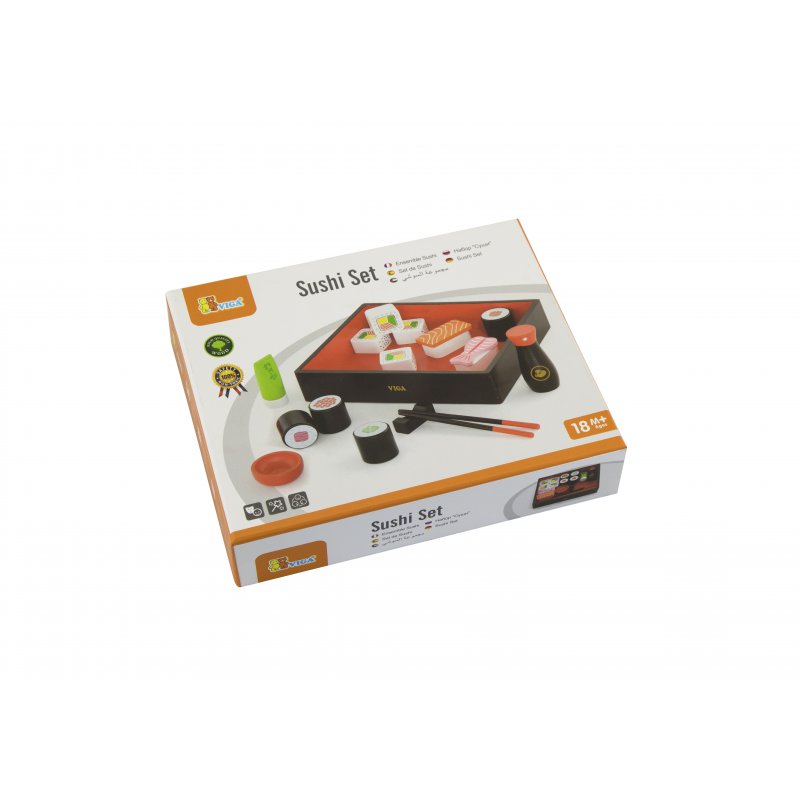Drewniana zabawka, która może posłużyć do nauki jedzenia sushi pałeczkami. Zawiera różne rodzaje sushi, sosy, oraz pałeczki.