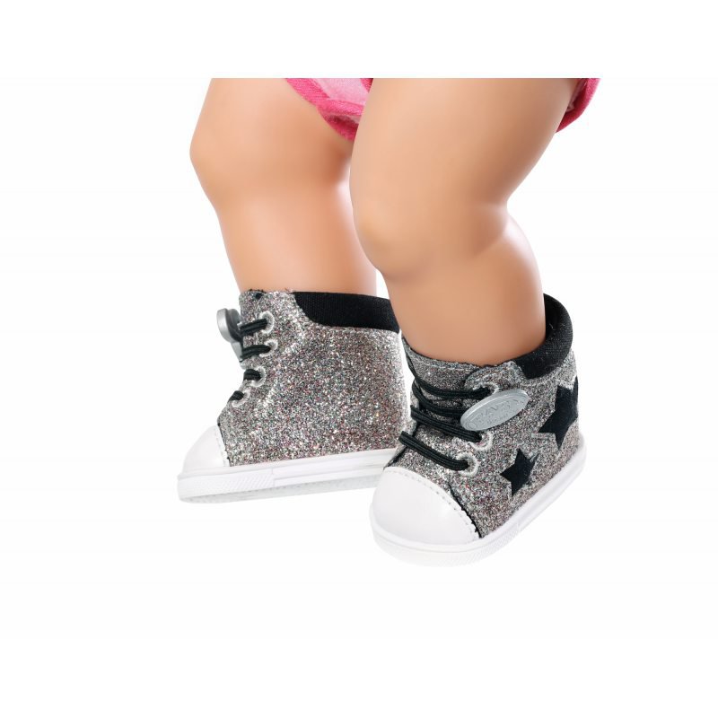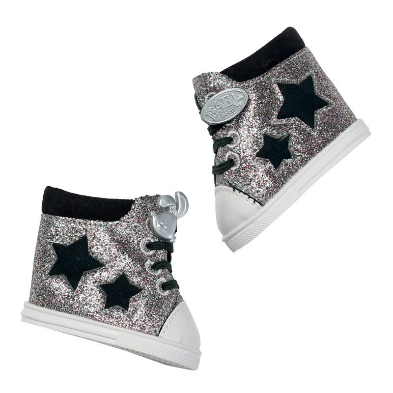 Tenisówki dla lalki W tych odlotowych, połyskujących trampkach za kostkę, BABY born® będzie świetnie się bawić. Para bucików w stylu glamour jest ozdobiona czarnymi detalami i doskonale pasuje do sportowej, casualowej, a nawet wieczorowej stylizacji twojej laleczki.