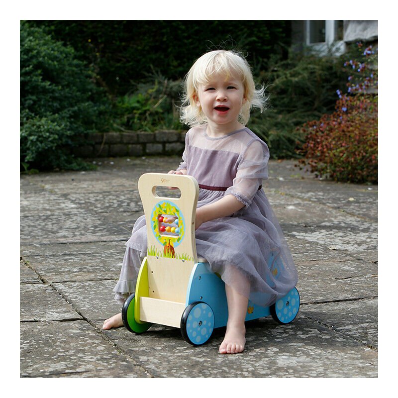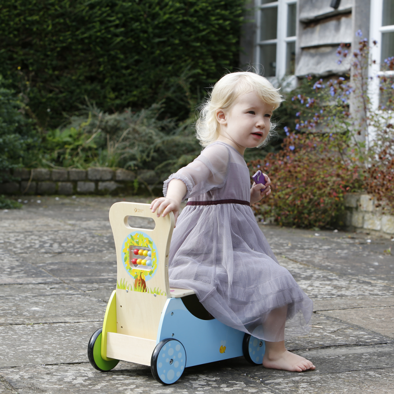 Drewniany pchacz dla dzieci z panelem edukacyjnym zaprojektowany przez cenionego producenta zabawek firmę Viga Toys przeznaczony dla maluchów od 18 miesiąca.