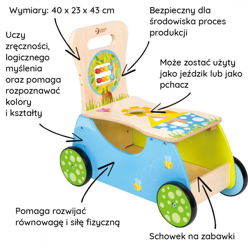 Drewniany Chodzik Pchacz Jeździk Sorter Wielofunkcyjny Pojazd Classic World