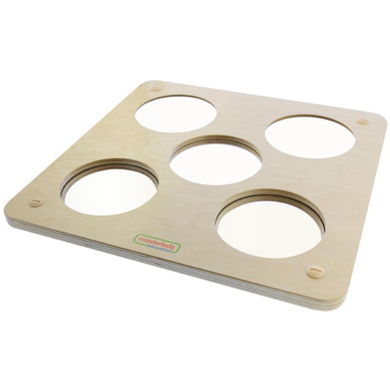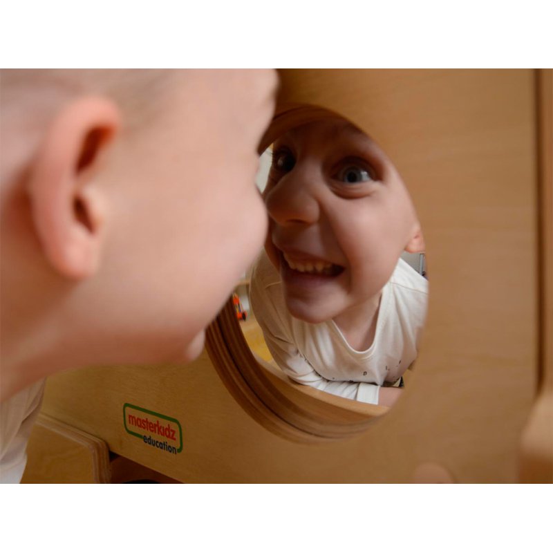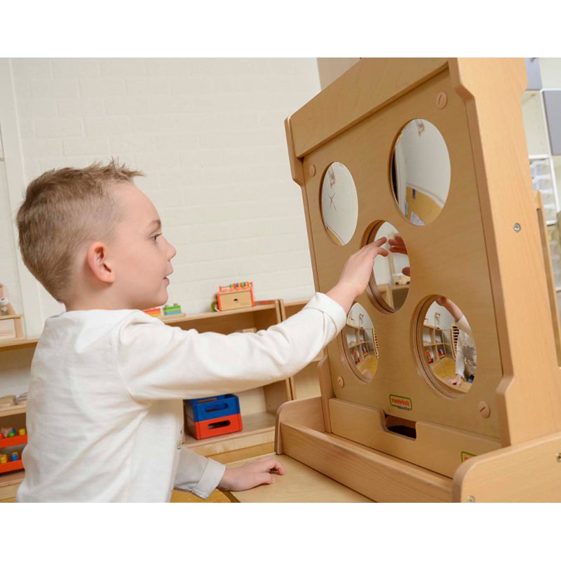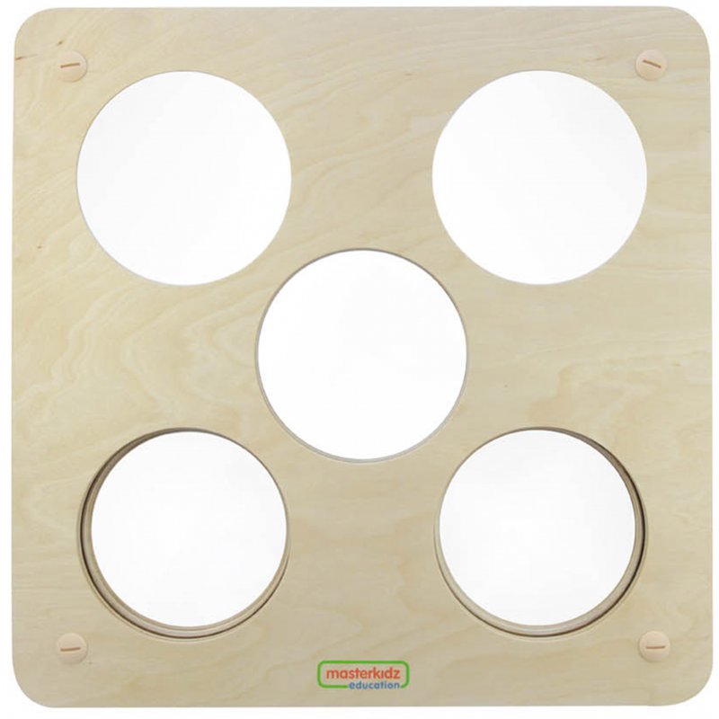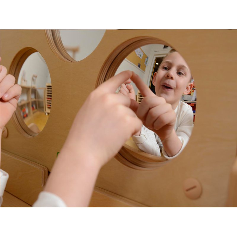 Świetna drewniana sensoryczna zabawka interaktywna tablica dla dzieci, posiadająca 5 okrągłych lusterek, zakrzywiających obraz w różny sposób. Jest to świetny sposób, by dziecko poznało właściwości różne rodzaju luster. Jedną z funkcji tablicy jest również budowanie samoświadomości, oraz pewności siebie dzieci, które przeglądają się w lustrach.