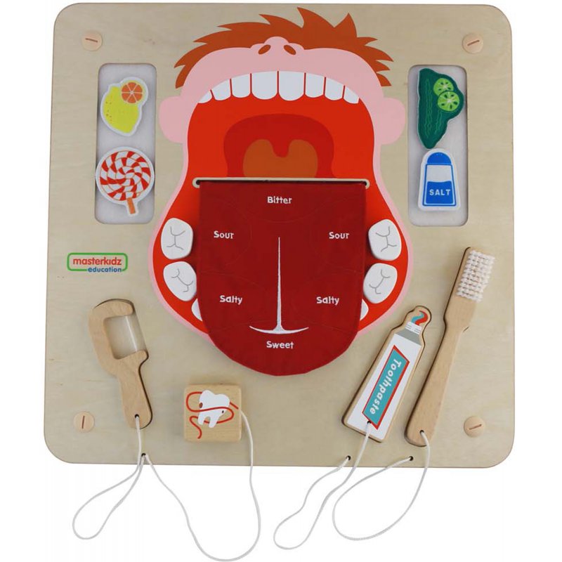 Tablica ścienna Masterkidz do montażu na ścianie, w systemie ściennym, lub wolnostojącym Masterkidz Flex. Przedstawia buzię z językiem i zębami. Tablica zawiera również szczoteczkę do zębów, pastę, nici dentystyczne, oraz różne rodzaje jedzenia, które można przypisać do rodzajów smaku: kwaśnego, gorzkiego, słodkiego i słonego.