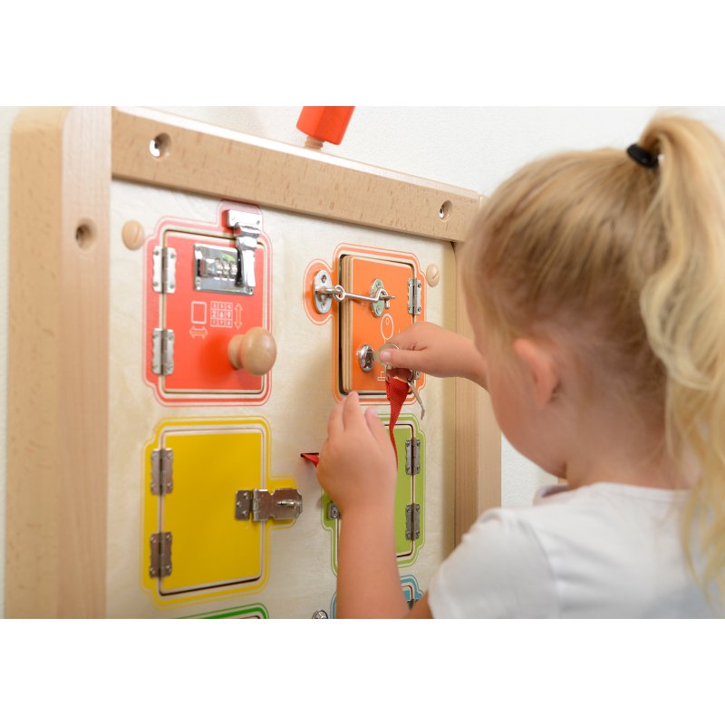 Drewniana tablica ścienna, którą można zamontować na ścianie, lub w systemie Masterkidz Flex - zarówno ściennym, jak i wolnostojącym statywie. Tablica składa się z drewnianej planszy, na której umieszczonych zostało 6 sejfów z różnymi zamkami. Zadaniem dziecka jest nauczenie się otwierania i zamykania każdego z zamków.
