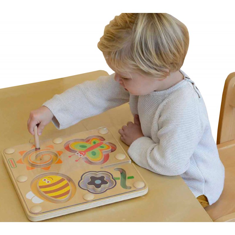 Drewniana tabliczka marki Masterkidz to świetna zabawka, która pozwala maluchowi na rozwinięcie swojej zręczności i koordynacji wzrokowo-ruchowej. Bawiące się dziecko ma za zadanie chwycić w dłoń magnetyczny patyczek, który znajduje się przy tabliczce, a następnie za jego pomocą poprowadzić piłeczki przez każdy z 4 labiryntów.