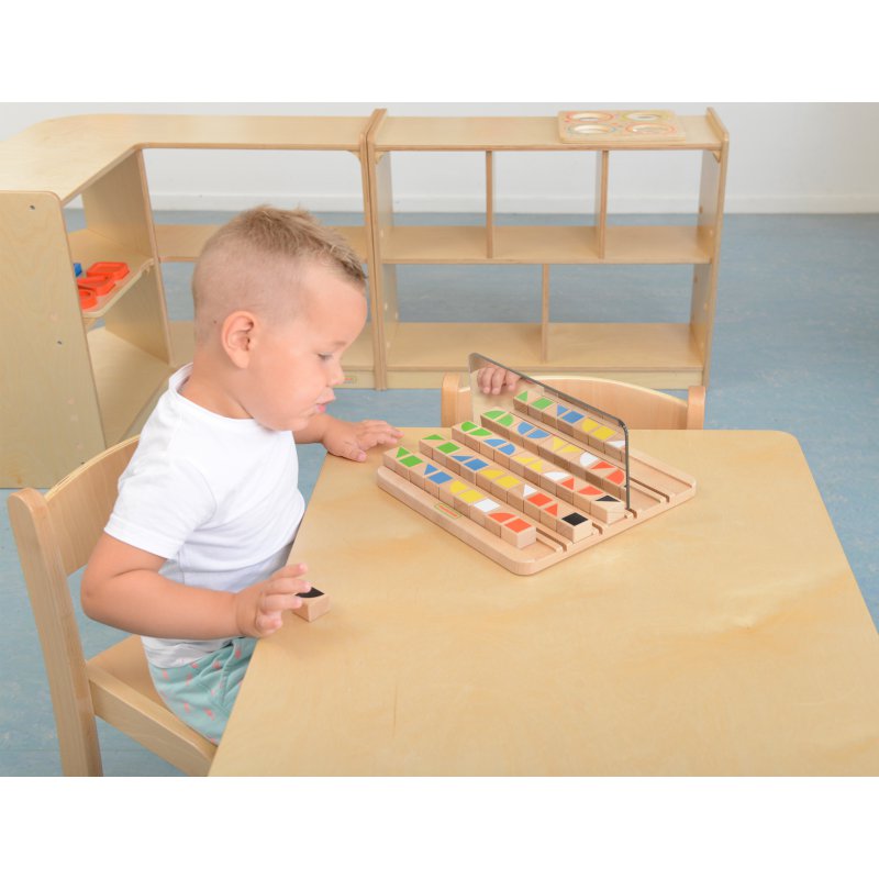 Edukacyjna tabliczka drewniana z kolorowymi klockami. Na klockach namalowane zostały różne kształty, dzięki czemu zabawa jest ciekawsza. Polega ona na układaniu różnych wzorów na drewnianej planszy, oraz ustawianiu akrylowego lusterka w taki sposób, by było w nim widać odbicie układanki.
