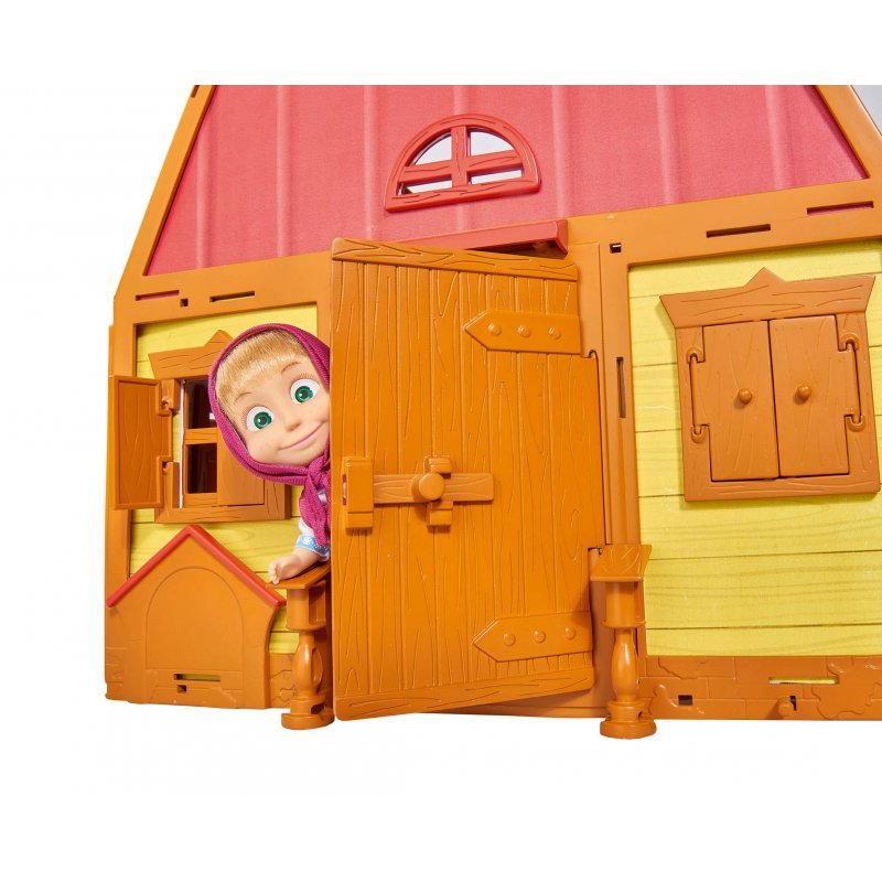 Domek Maszy oferuje wiele możliwości zabawy! Wyposażony jest w wiele elementów, które pełnią funkcję wyposażenia wnętrza: schodki, łóżeczko, stolik, krzesełka, magiczną skrzynkę oraz laleczkę o wysokości 12 cm w klasycznej, letniej sukience. Domek posiada otwierane okiennice oraz drzwi z możliwością zamknięcia na zasuwę.