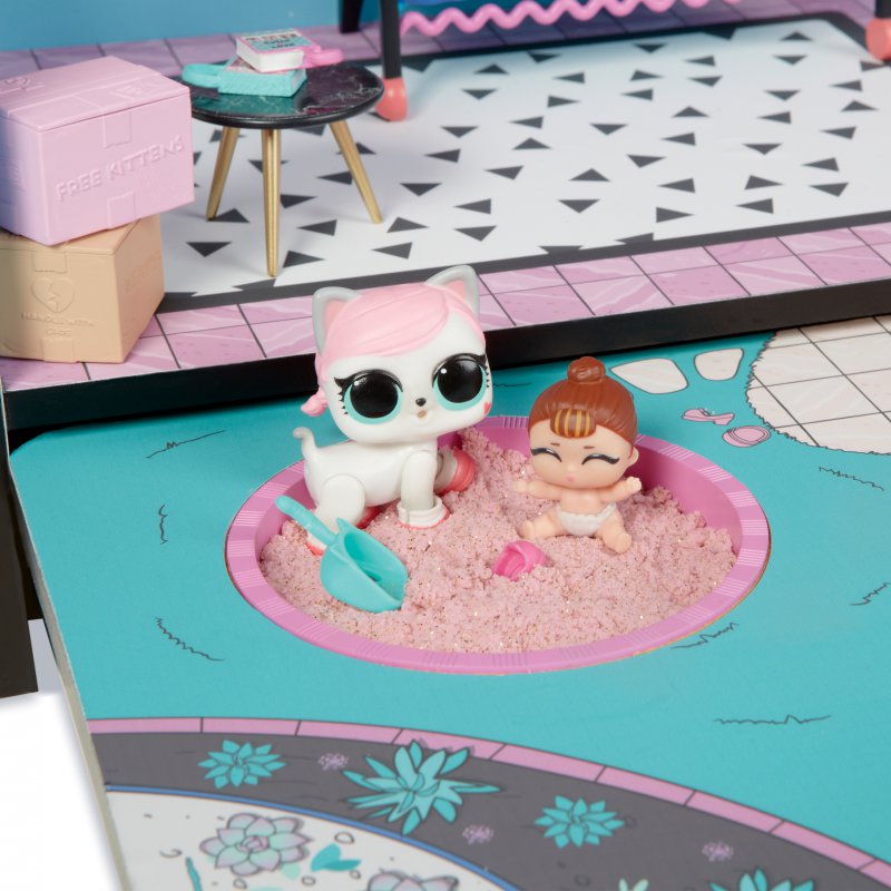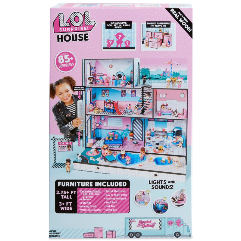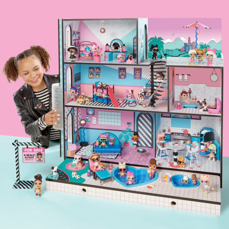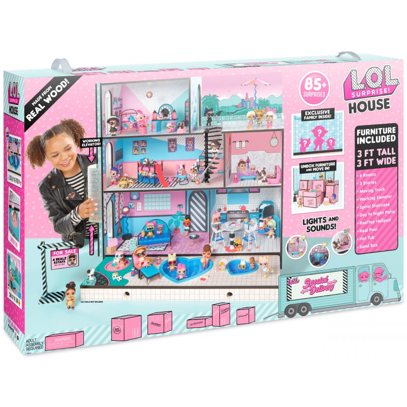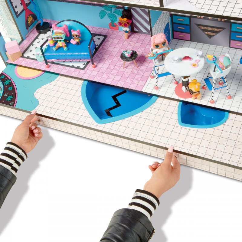 Domek L.O.L. Surprise! jest najlepszym miejscem dla laleczek. Trzypiętrowy domek posiada 6 pokoi,działającą windę, efekty świetlne i dźwiękowe, prawdziwy basen, spa i piaskownicę! Domek L.O.L. to niezbędne uzupełnienie kolekcji laleczek Surprise.