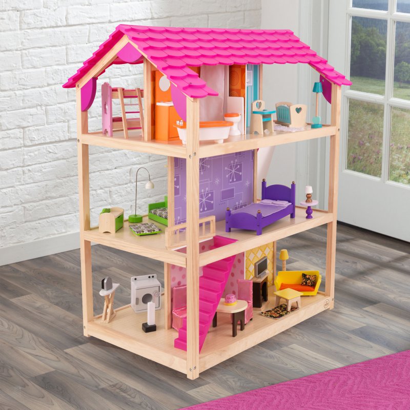 Duży, drewniany domek dla lalek od firmy KidKraft. Domek składa się z 10 pomieszczeń między innymi: kuchnia, łazienka, taras, salon, pokój oraz sypialnia. W zestawie znajduje się w sumie 45 mebelków i dodatków, między innymi łóżko z baldachimem, wanna, stolik, krzesełka i komoda. Dzięki dużym rozmiarom z domku może korzystać więcej niż tylko jedno dziecko.