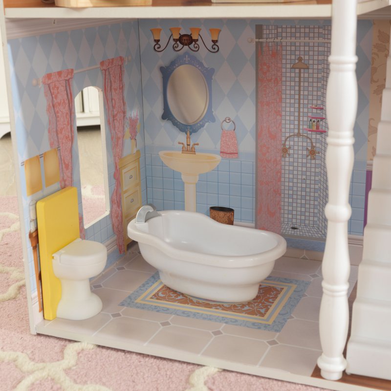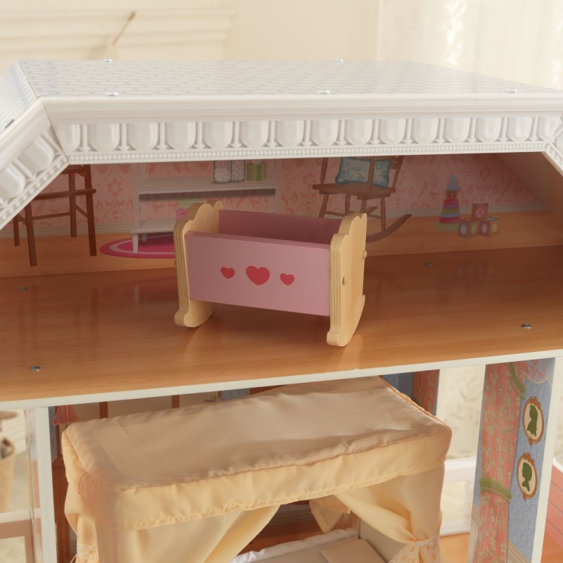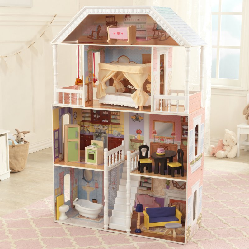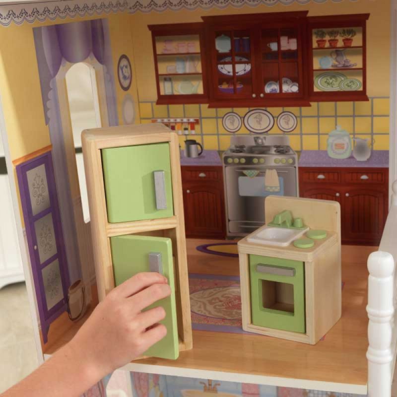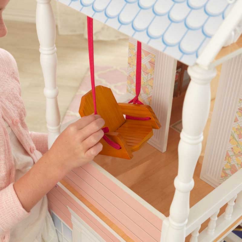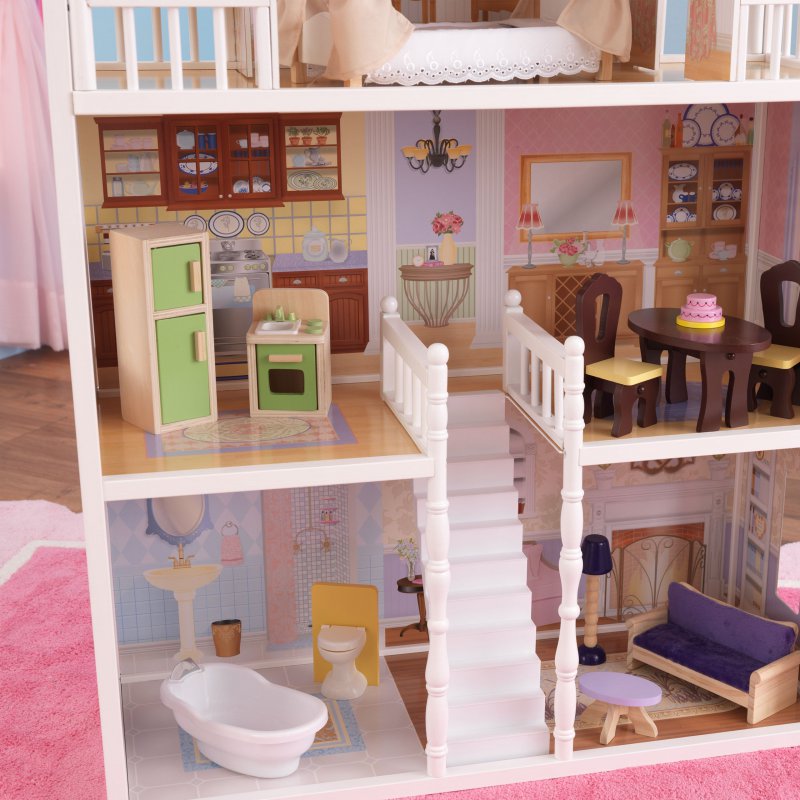Duży, drewniany domek dla lalek od firmy KidKraft. Domek składa się z 8 pomieszczeń między innymi: kuchnia, łazienka, taras, salon, pokój oraz sypialnia. W zestawie znajduje się w sumie 14 mebelków i dodatków, między innymi łóżko z baldachimem, wanna, stolik, krzesełka i komoda. Dzięki dużym rozmiarom z domku może korzystać więcej niż tylko jedno dziecko.