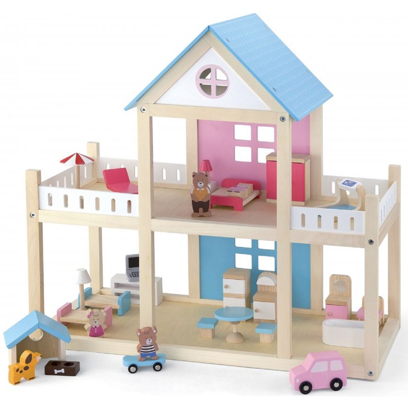 Drewniany domek dwupiętrowy dla lalek dla dzieci od lat 3 zaprojektowany przez cenionego producenta zabawek dziecięcych firmę Viga Toys. Zestaw z laleczkami oraz mebelkami