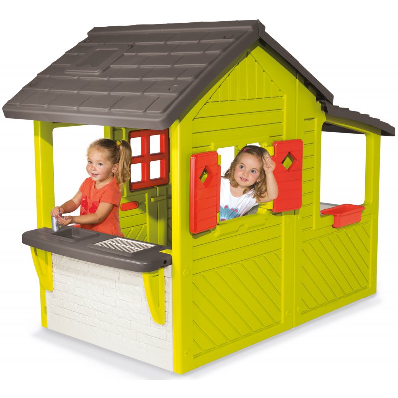 FUNKCJE I ZALETY: • przestronny domek z werandą i blatem kuchennym • dużo przestrzeni do zabawy - wnętrze domku,weranda • imitacja różnorodnych materiałów - drewna, kamienia, itp. • efekty dźwiękowe - elektroniczny dzwonek przy drzwiach • wyposażony w drzwi, otwierane okna, blat kuchenny ze zlewem i barbecue, doniczki • wykonany z wytrzymałych materiałów, odpornych na blaknięcie - powłoka anty UV • łatwy w montażu