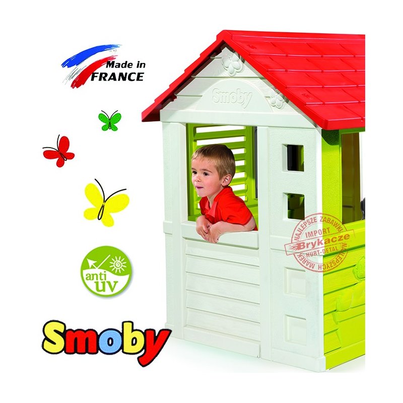 Domek z okiennicami i podłogą na całą długość domku. Całość konstrukcji wykonana z tworzywa sztucznego. Dłuższe ścianki domku posiadają duże podwójne otwory - okna, tak, aby dzieci mogły przez nie wyglądać a zarazem być pod stałą opieką.