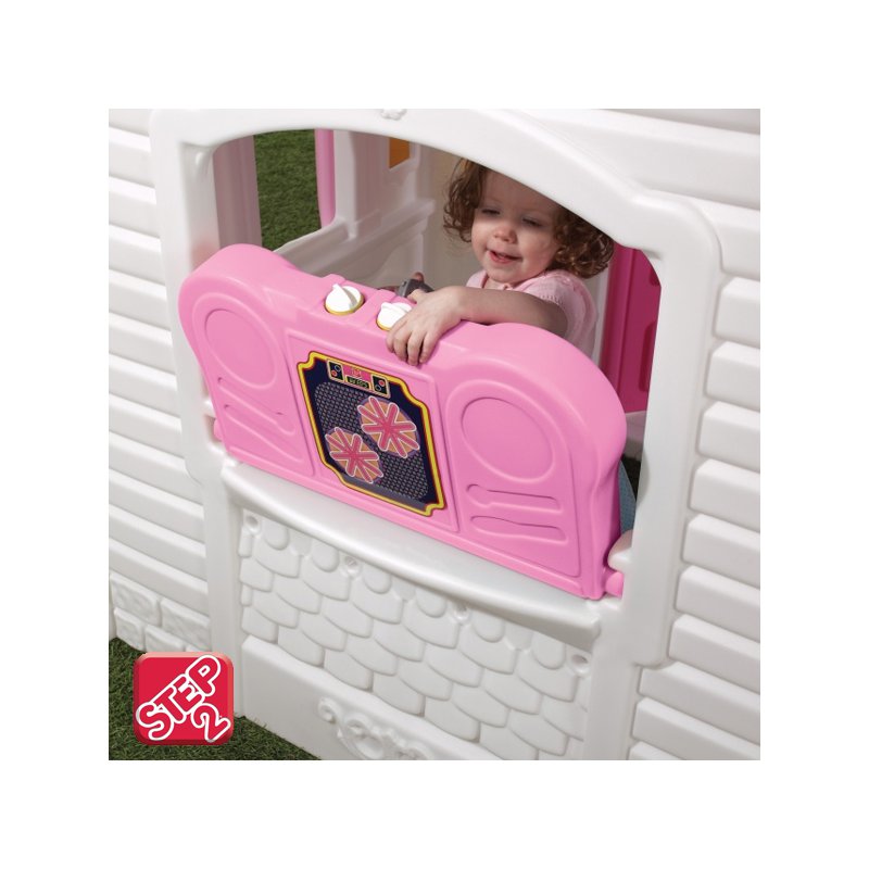 Uroczy biały domek STEP2 w różowe serduszka z zamykanymi plastikowymi okiennicami, dekoracyjnym dachem ze świetlikiem i stylowymi drzwiami. Ze względu na kolory każda mała dziewczynka będzie się czuła w nim jak księżniczka.