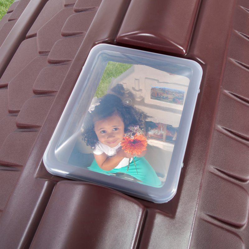 W uroczej chatce najmłodsi do dyspozycji mają wbudowany zlew kuchenny z obrotowym kranem oraz miejsce, w którym można spożywać posiłki na świeżym powietrzu. Duża przestrzeń i solidna konstrukcja pozwala na zabawę wielu dzieciom jednocześnie. Elektroniczny dzwonek do drzwi sprawi, że dzieci będą wiedziały kiedy przybyli ich goście. Duże doniczki umożliwiają dzieciom sadzenie kwiatków.