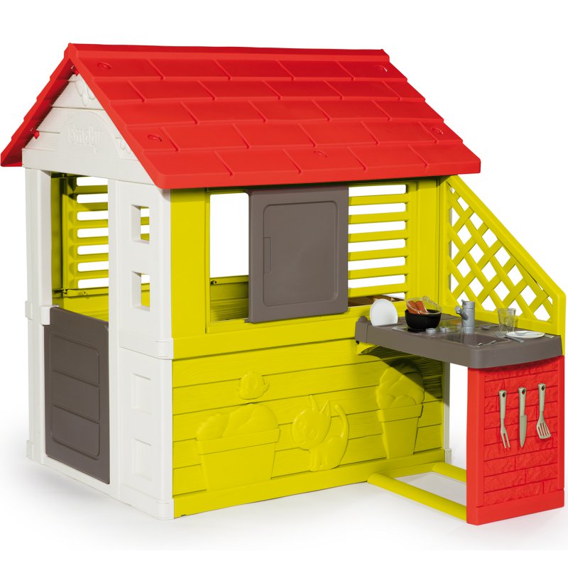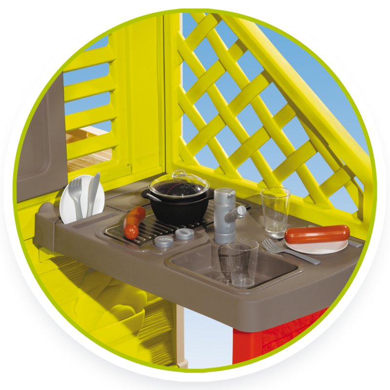 Nowa wersja realistycznego domku Smoby My House ze stołem piknikowym w ciekawej, wiosennej kolorystyce z elektronicznym dzwonkiem do drzwi i skrzynką na listy.