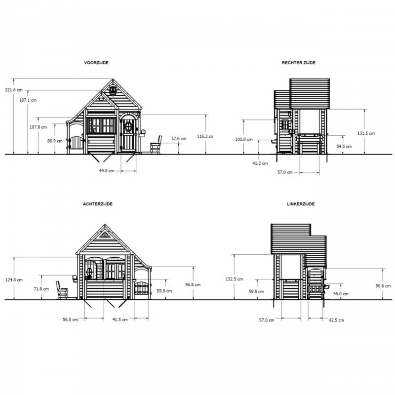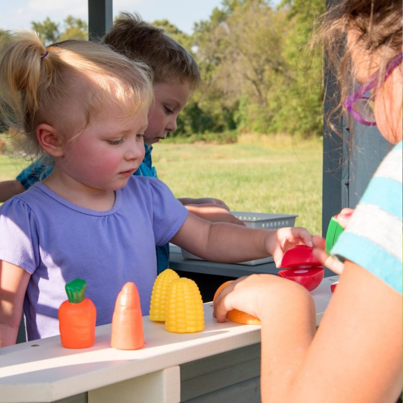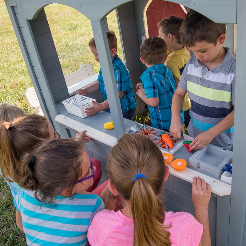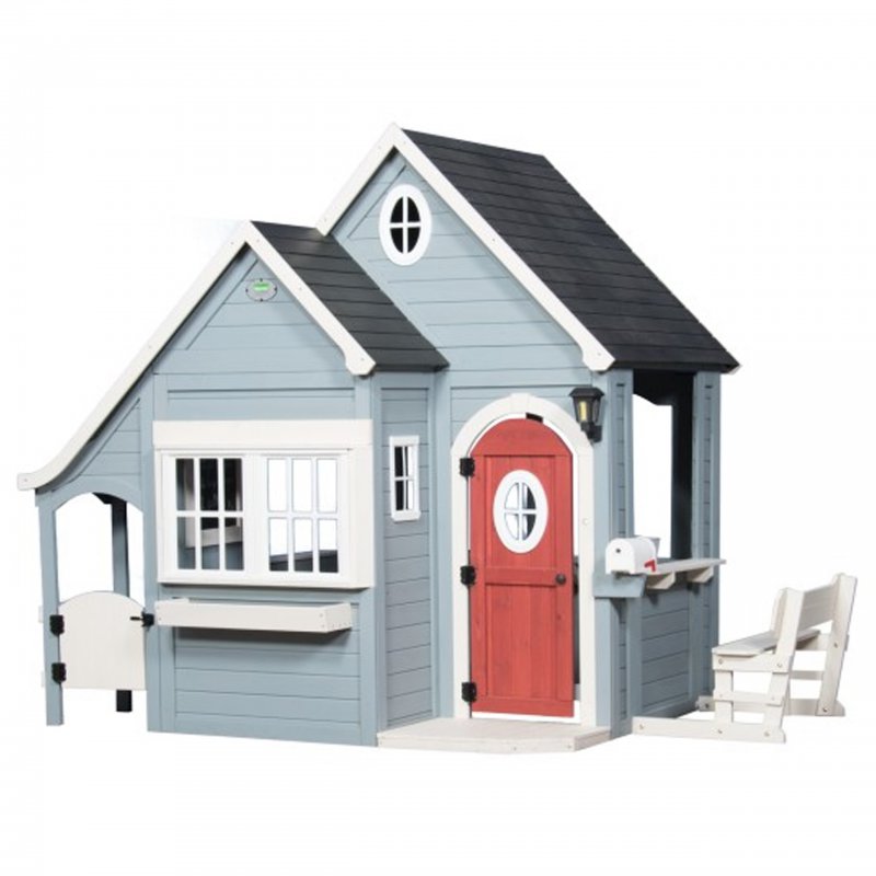Wiosenny domek dla dzieci, ogrodowy z ławką piknikową oraz w pełni wyposażoną kuchnią z umywalką, kuchenką, deską do krojenia i akcesoriami spożywczymi, które można kroić. Domek został wyposażony w dzwonek oraz doniczkę, która umiejscowiona jest przy oknie, najbliżej drzwi.