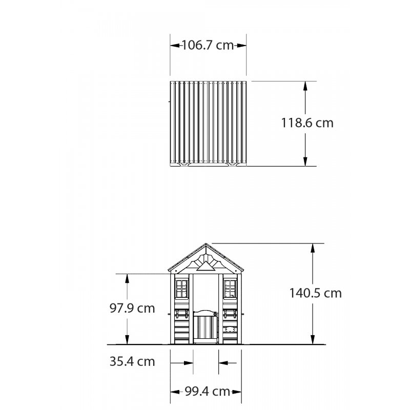 Domek z okiennicami i podłogą na całą długość domku. Całość konstrukcji wykonana z tworzywa sztucznego. Dłuższe ścianki domku posiadają duże podwójne otwory - okna, tak, aby dzieci mogły przez nie wyglądać a zarazem być pod stałą opieką.