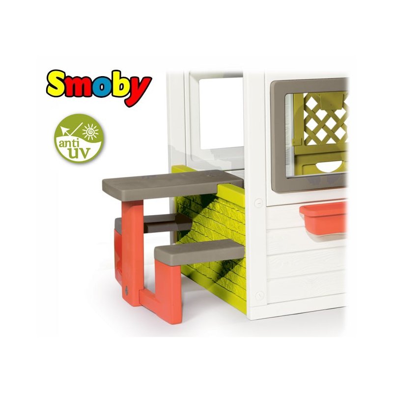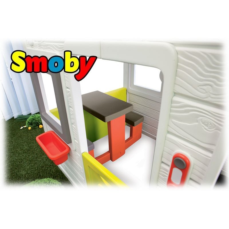 Nowa wersja realistycznego domku Smoby My House ze stołem piknikowym w ciekawej, wiosennej kolorystyce z elektronicznym dzwonkiem do drzwi i skrzynką na listy.