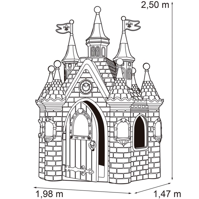 Przestronny, realistycznie wykonany pałac zabawowy z dziewięcioma wieżami i zegarem. Otwierane drzwi wyposażone w kołatkę jak w prawdziwym pałacu. Kolejnym atutem są obszerne okna oraz wnętrze zdobione na wzór prawdziwego pałacu. Stabilna podstawa zapewnia bezpieczną zabawę. Pałac jest niezwykle łatwy w montażu. Całość wykonana jest z kolorowego tworzywa odpornego na promieniowanie słoneczne i temperaturę.