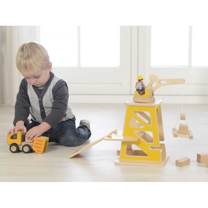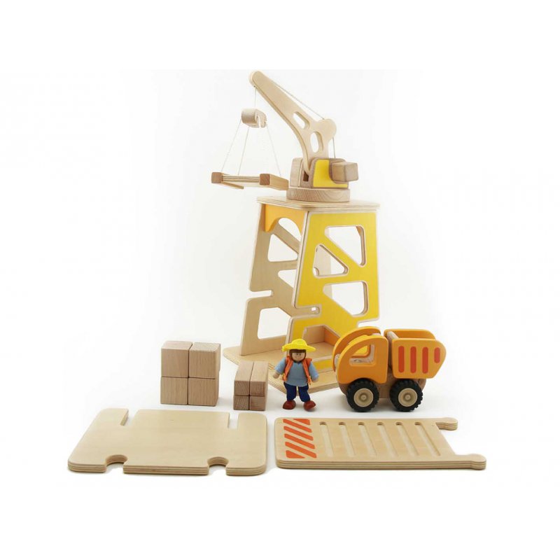 Na placu budowy dzieje się wiele fascynujących rzeczy! Pracuje tu żuraw, który wciąga materiały budowlane na szczyt konstrukcji. Te z kolei dostarczane są samochodem dostawczym, który również jest w zestawie. Ludzik-robotnik może być kierowcą, operatorem żurawia, lub może ręcznie montować elementy konstrukcyjne.