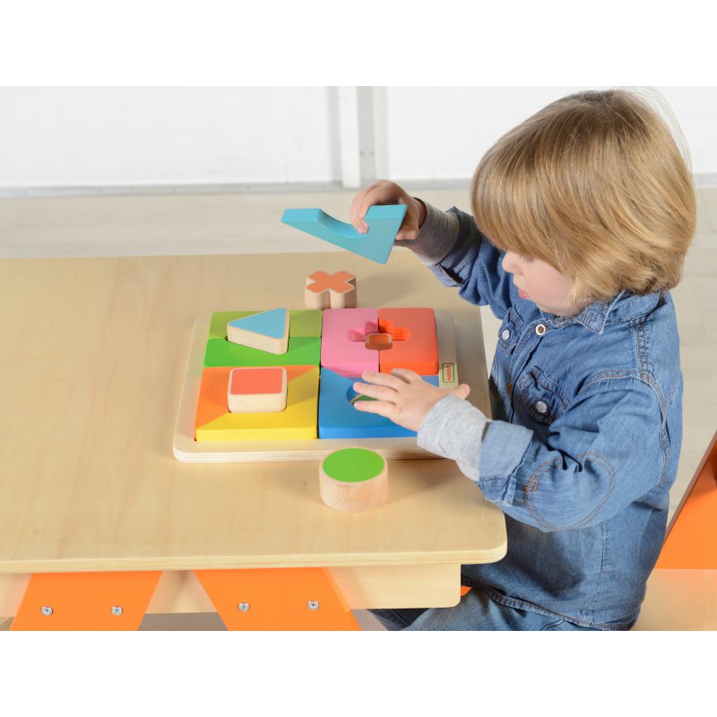 Drewniana kolorowa układanka jest genialną zabawką interaktywną dla maluchów, które lubią wyzwania. Ich zadaniem jest ułożenie puzzli składających się z 12 elementów o różnych rozmiarach, kolorach i kształtach. Drewniana tablica podpowiada w jaki sposób należy układać, ale od dziecka wymagane jest skupienie i logiczne myślenie. Układanka posiada cztery podstawowe kształty, których może nauczyć się dziecko podczas zabawy, oraz kolorowe ramki dla każdego z nich, które również należy ułożyć z puzzli.
