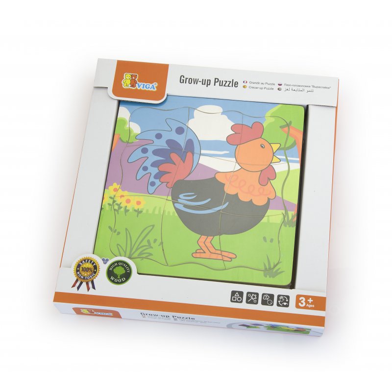 Puzzle drewniane Viga Toys Jak rośnie kogucik zaprojektowane zostały przez cenionego producenta zabawek drewnianych firmę Viga Toys dla dzieci od 18 miesiąca życia, doskonałe do przedszkola jak i do domu.