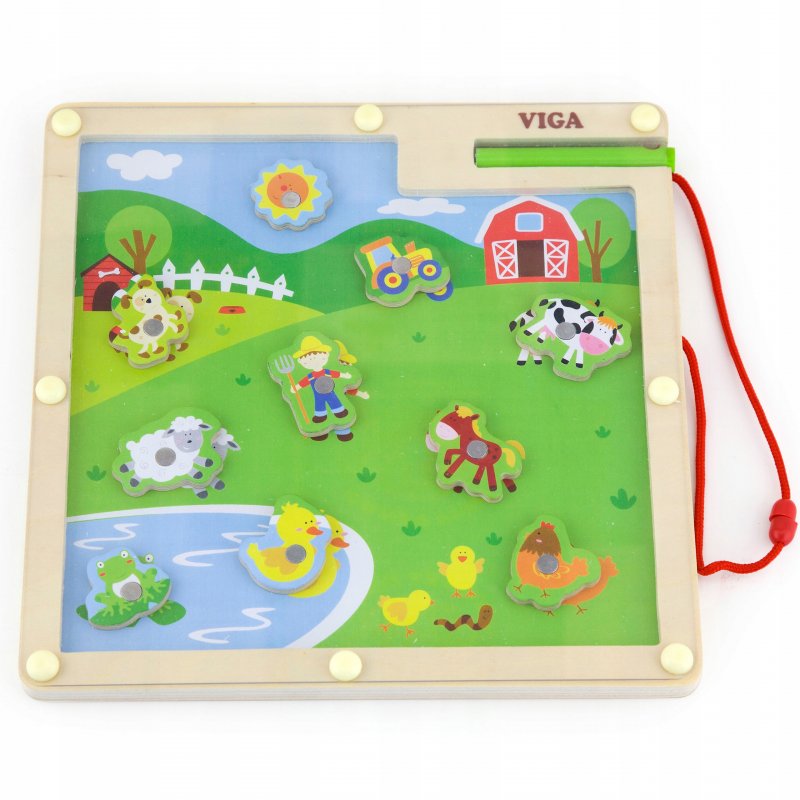 Drewniana tablica z obrazem farmy zapewni dzieciom mnóstwo zabawy. Dzięki magnetycznej pałeczce możemy pomóc zwierzakom odprowadzając każde z nich do odpowiednich miejsc.