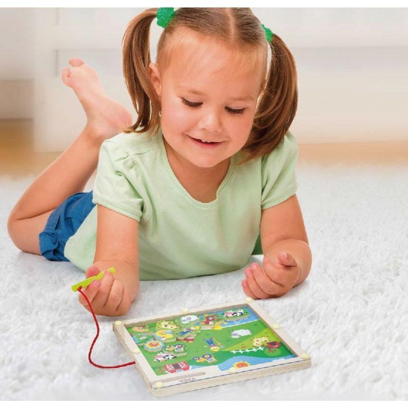 Dzięki magnetycznej pałeczce możemy pomóc zwierzakom odprowadzając każde z nich do odpowiednich miejsc: pieska do budy, żabkę i kaczuszkę do stawu, kurkę, konika, krówkę i owieczkę na łąkę, gdzie będą mogły zjeść świeżą trawę i cieszyć się słonecznym dniem… Zabawa rozwija zdolności koordynacji ręka – oko i zdolności motoryczne.