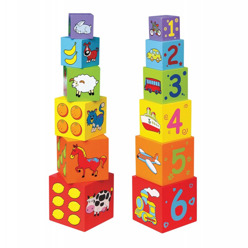 W zestawie 6 drewnianych klocków w różnych rozmiarach. Każda ścianka klocka zawiera inny obrazek, dzięki czemu uczy czego innego.