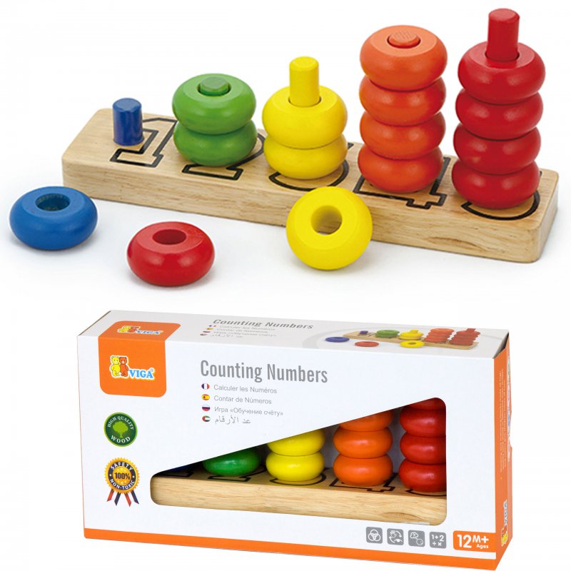 Drewniana zabawka edukacyjna, dzięki której dziecko zrobi pierwsze kroki w nauce liczenia. Na drewnianej podstawie znajdują się słupki opisane liczbami, na które należy nałożyć obręcze w odpowiednim kolorze i ilości.